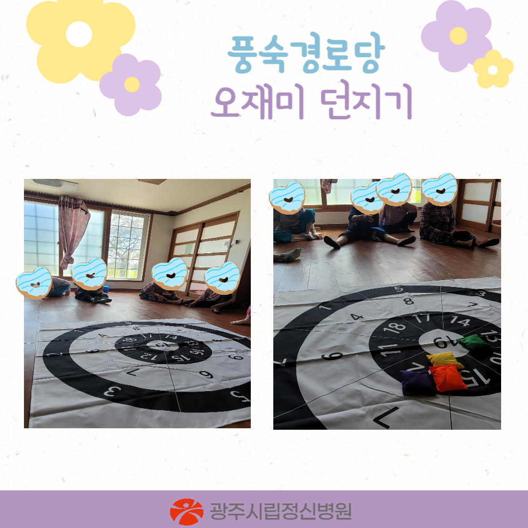 경로당을 이용하는 어르신들에게 스트레스 완화를 위한 정신건강 증진을 도모하고자 세라밴드 운동프로그램 및 투호, 오재미 던지기를 진행하였습니다.