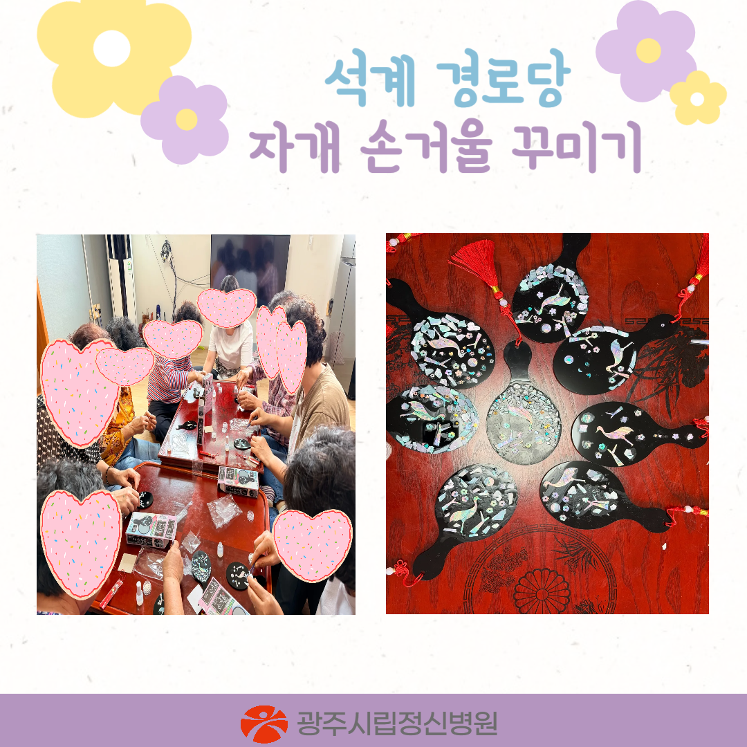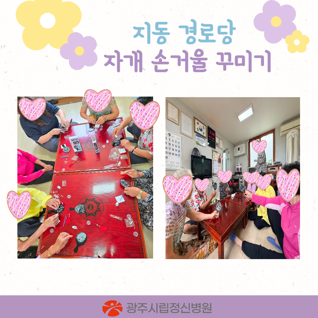 경로당을 이용하는 어르신들에게 스트레스 완화를 위한 정신건강 증진을 도모하고자 자개손거울 꾸미기 및 세라밴드 운동을 진행하였습니다.