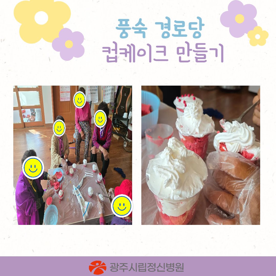 경로당을 이용하는 어르신들에게 스트레스 완화를 위한 정신건강 증진을 도모하고자 컵케이크 만들기 및 세라밴드 운동을 진행하였습니다.