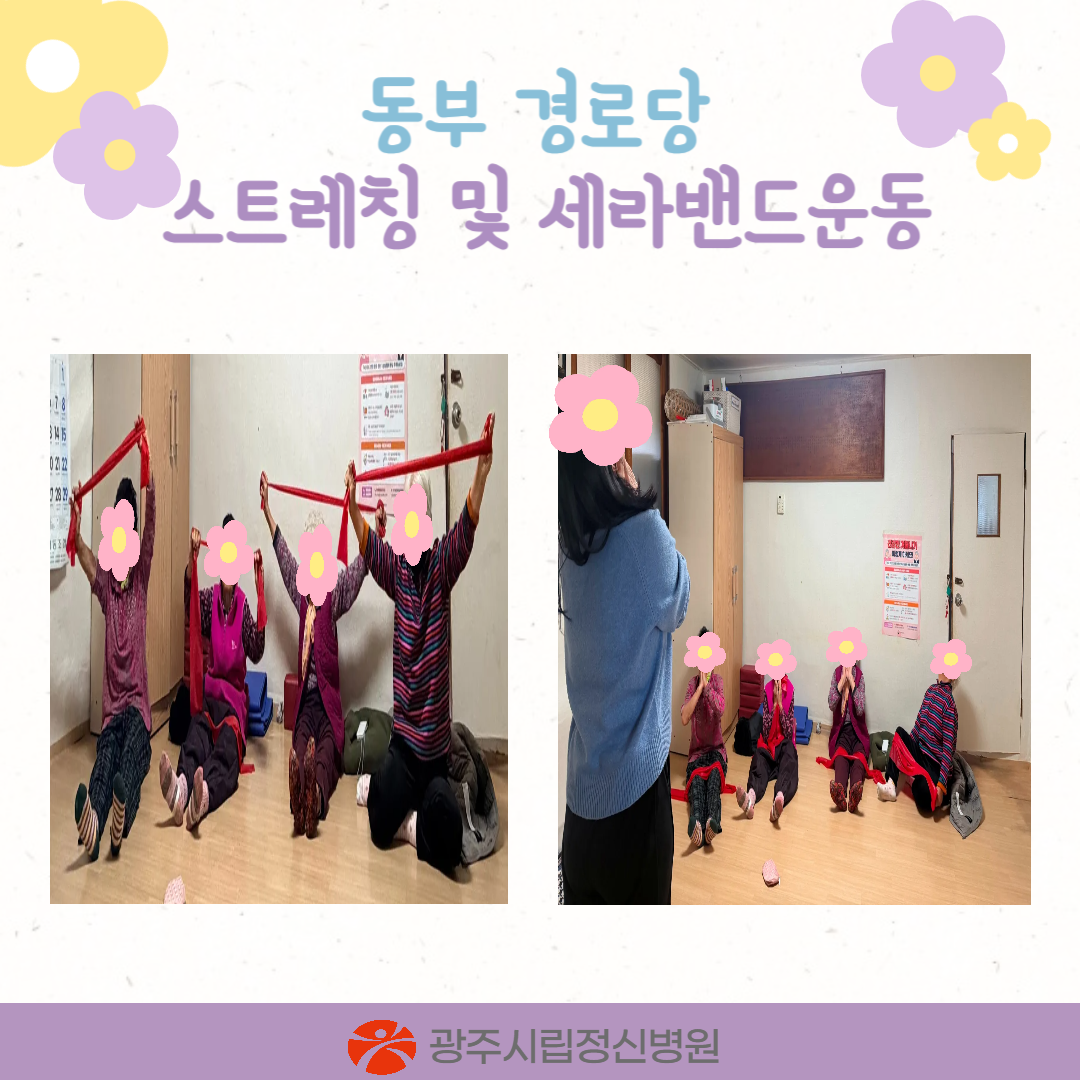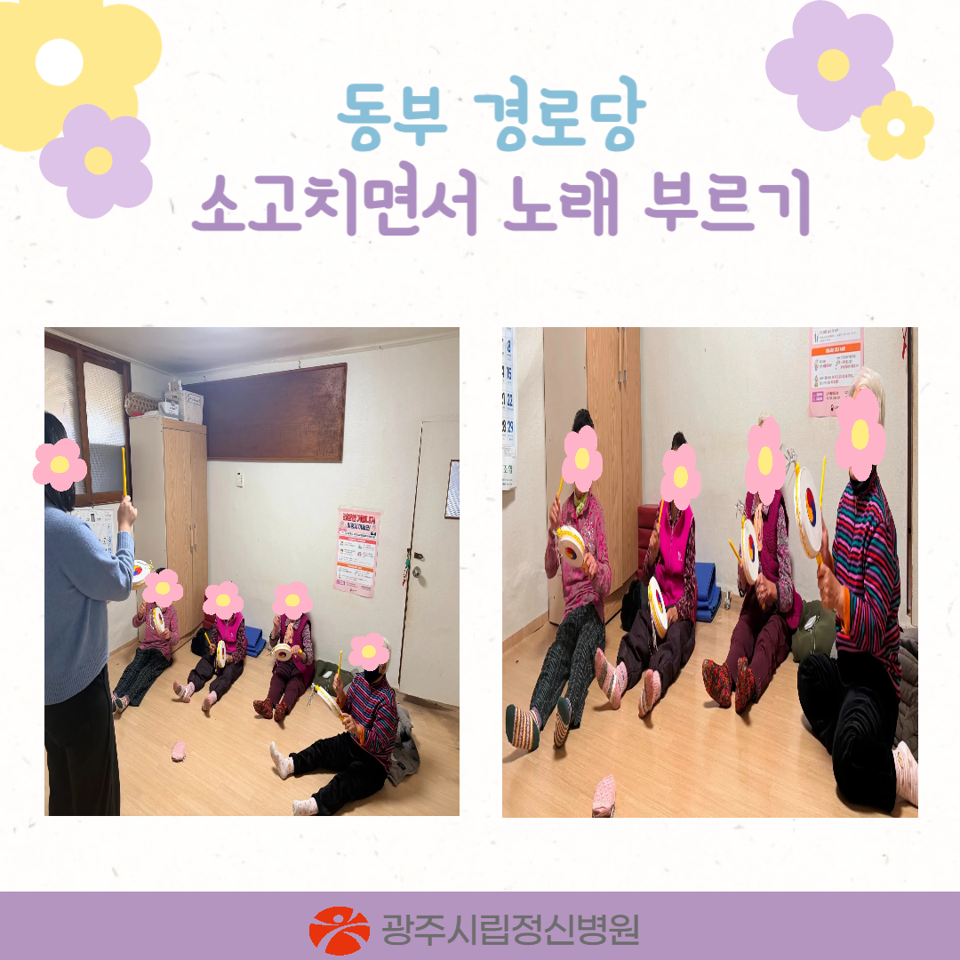 경로당을 이용하는 어르신들에게 스트레스 완화를 위한 정신건강 증진을 도모하고자 세라밴드 운동 및 노래부르면서 소고치기, 스트레스 사후 검사, 만족도 조사를 진행하였습니다.