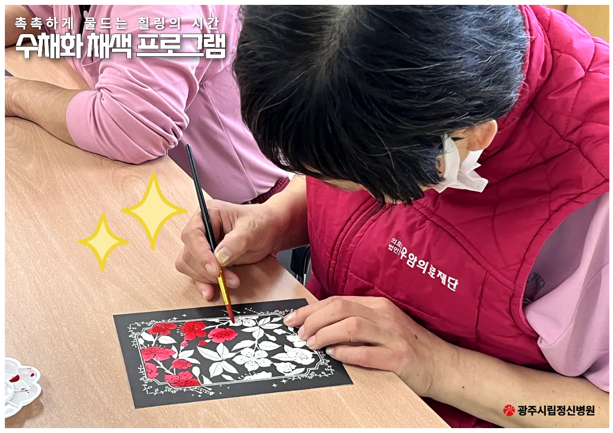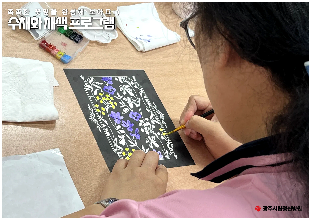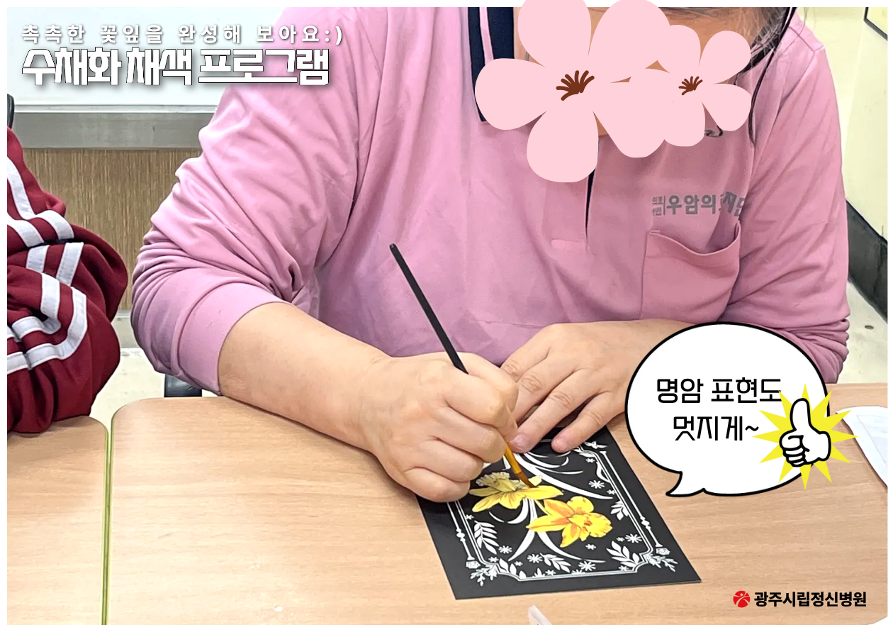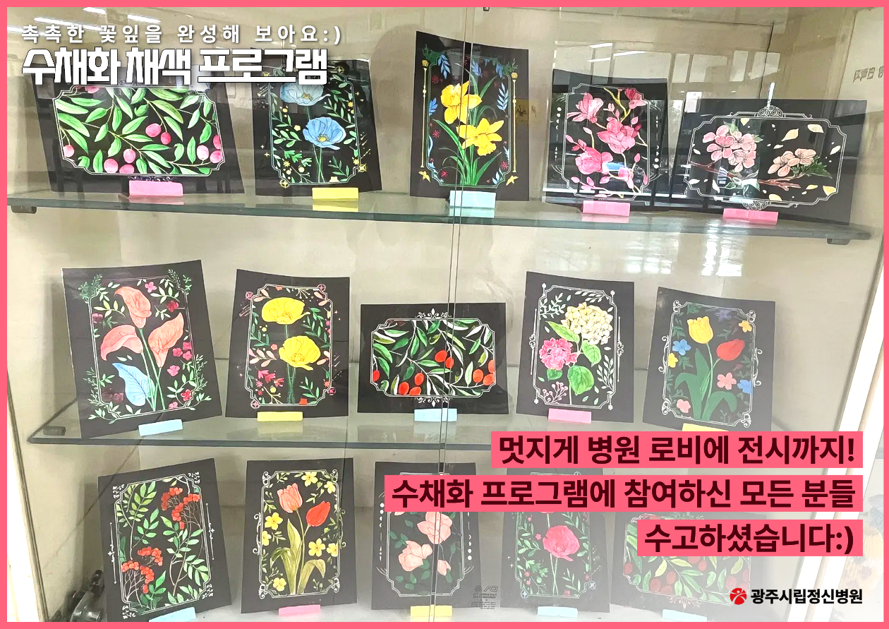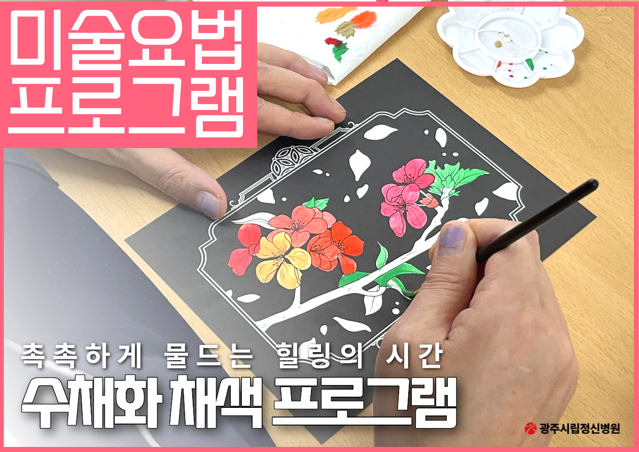 어느덧 찬 바람이 부는 11월, 열린병동과 고운병동은 알록달록한 꽃잎들로 가득 찼습니다. 수채화 키트를 활용해 예쁜 꽃을 그려보는 시간을 가졌는데요.