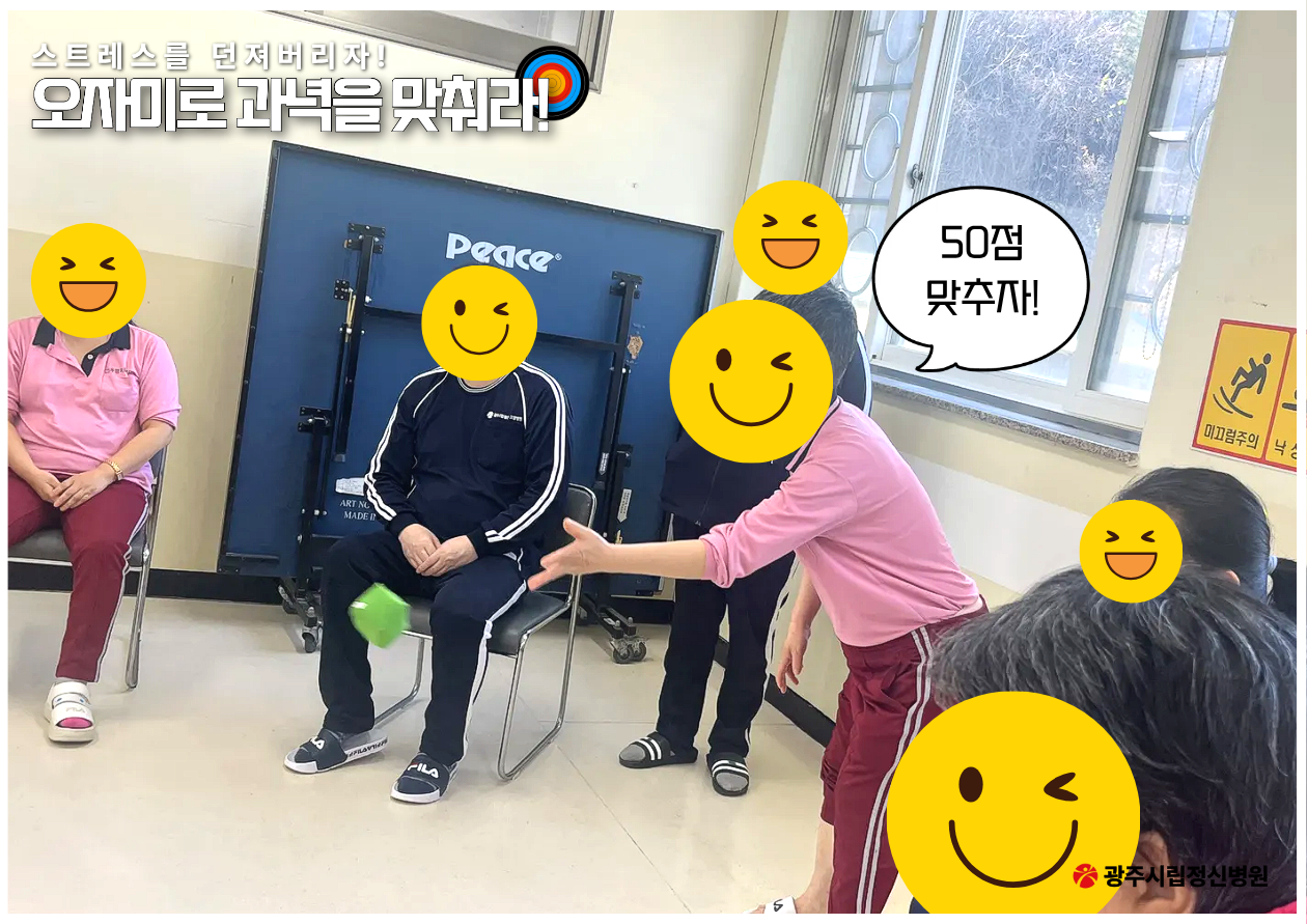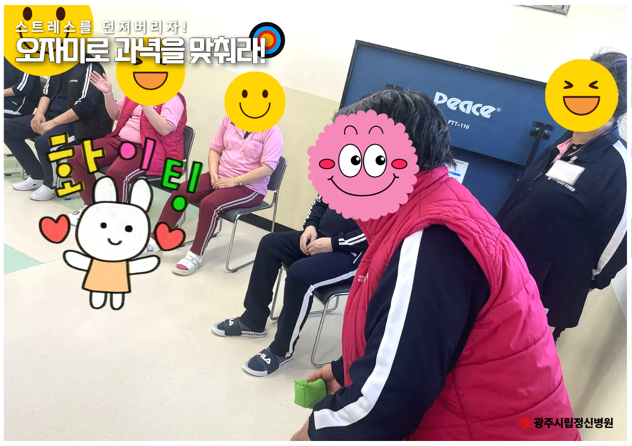 12월을 맞아 열린병동에서는 활기찬 에너지가 가득한 '과녁을 맞춰라!' 레크레이션 활동이 진행되었습니다. 커다란 과녁을 향해 오자미를 던지며 득점을 겨루는 이번 활동을 통해, 환우분들은 함께 응원하고 소통하며 화합의 기쁨을 나누었습니다. 집중력과 신체 활력을 높이는 것은 물론, 마음껏 웃고 즐기며 스트레스를 해소하는 소중한 시간이었습니다.
