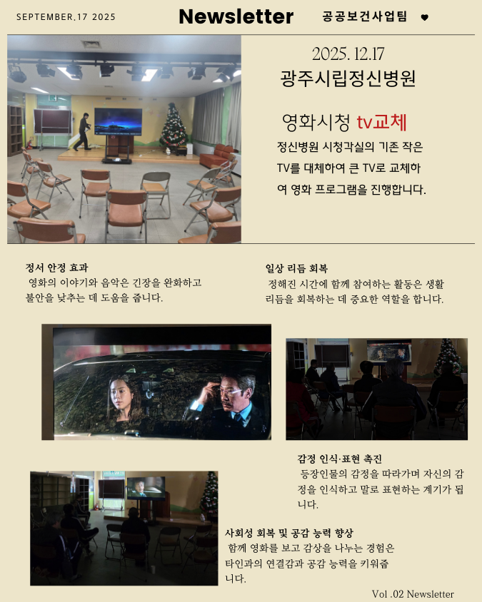 광주시립정신병원에서는 정신공공사업팀 주관으로 치료 프로그램의 일환인 영화시청 활동이 진행되었습니다.
