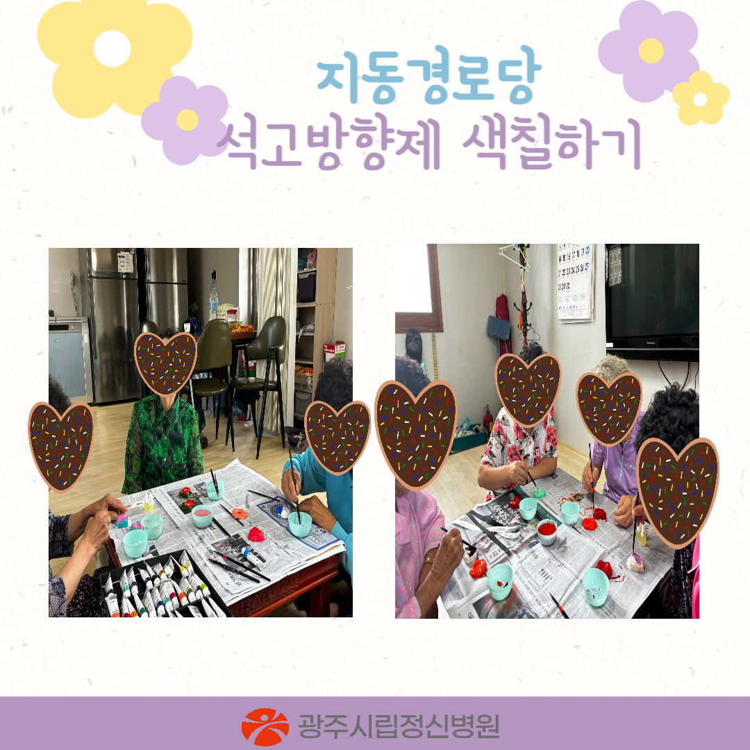 경로당을 이용하는 어르신들에게 스트레스 완화를 위한 정신건강 증진을 도모하고자 세라밴드 운동프로그램 및 석고방향제 색칠하기를 진행하였습니다.