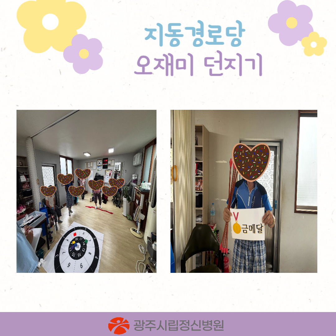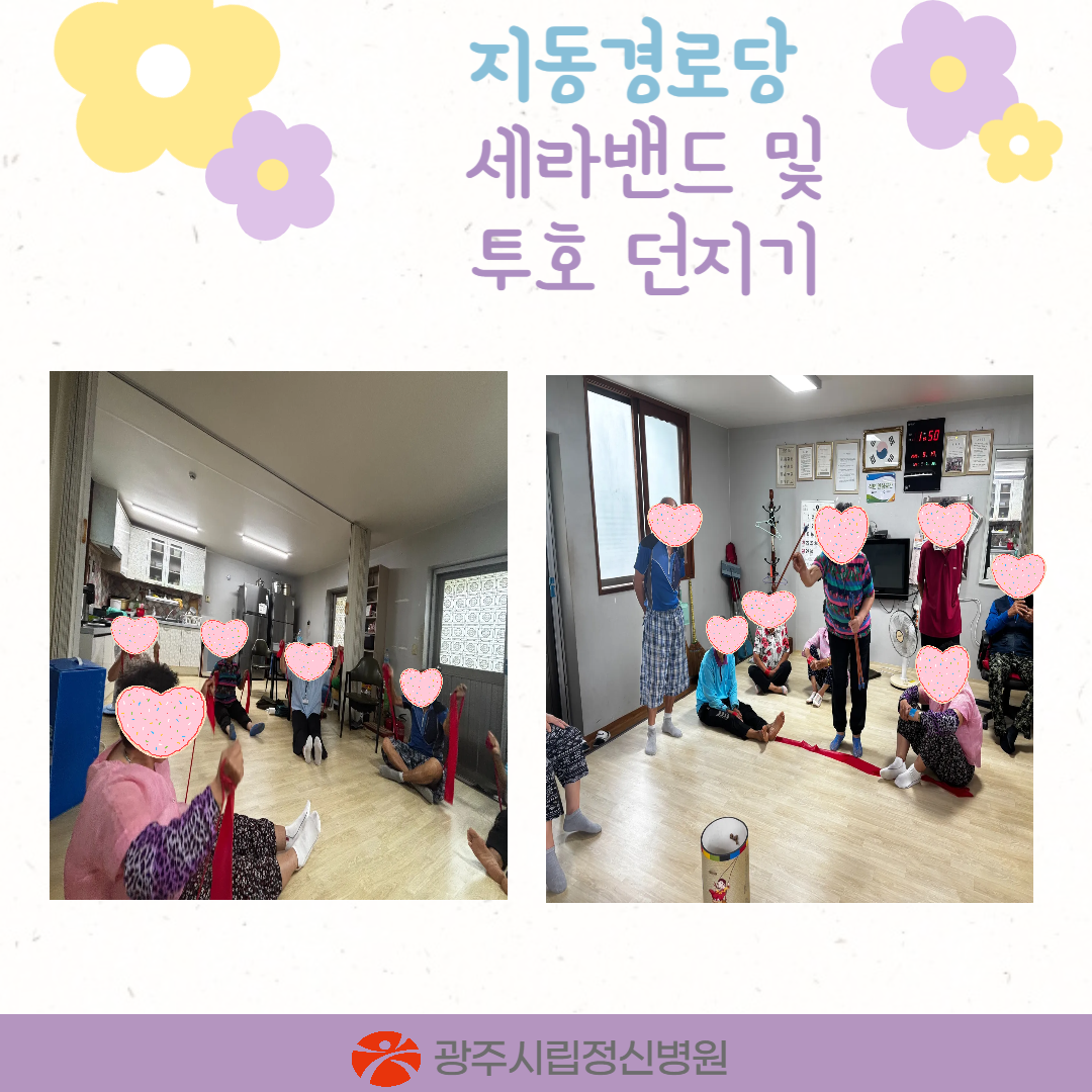 경로당을 이용하는 어르신들에게 스트레스 완화를 위한 정신건강 증진을 도모하고자 세라밴드 운동프로그램 및 투호, 오재미 던지기,오란다 만들기를 진행하였습니다.