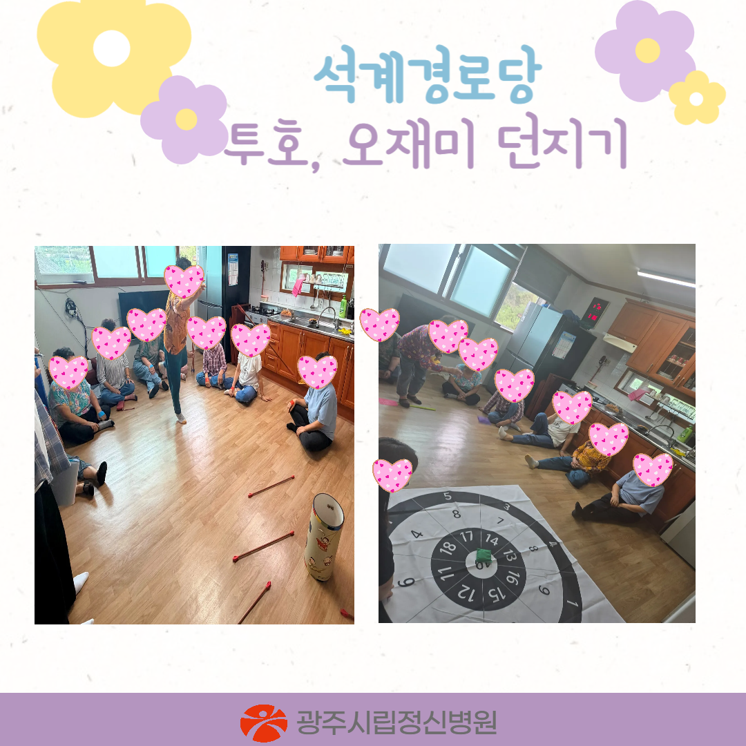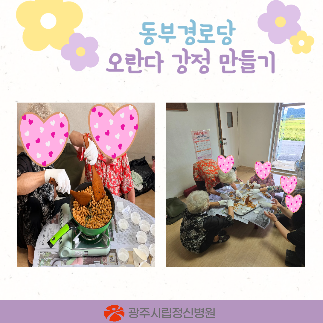 경로당을 이용하는 어르신들에게 스트레스 완화를 위한 정신건강 증진을 도모하고자 오란다 강정 만들기 및 스트레칭, 투호, 오재미 던지기를 진행하였습니다.