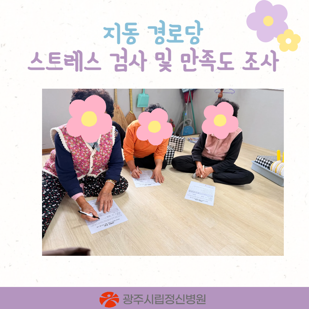 경로당을 이용하는 어르신들에게 스트레스 완화를 위한 정신건강 증진을 도모하고자 세라밴드 운동 및 노래부르면서 소고치기, 스트레스 사후 검사, 만족도 조사를 진행하였습니다.