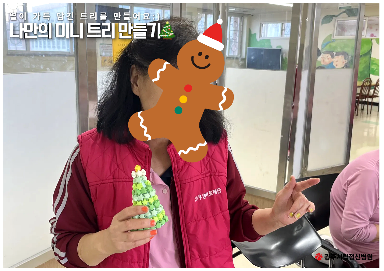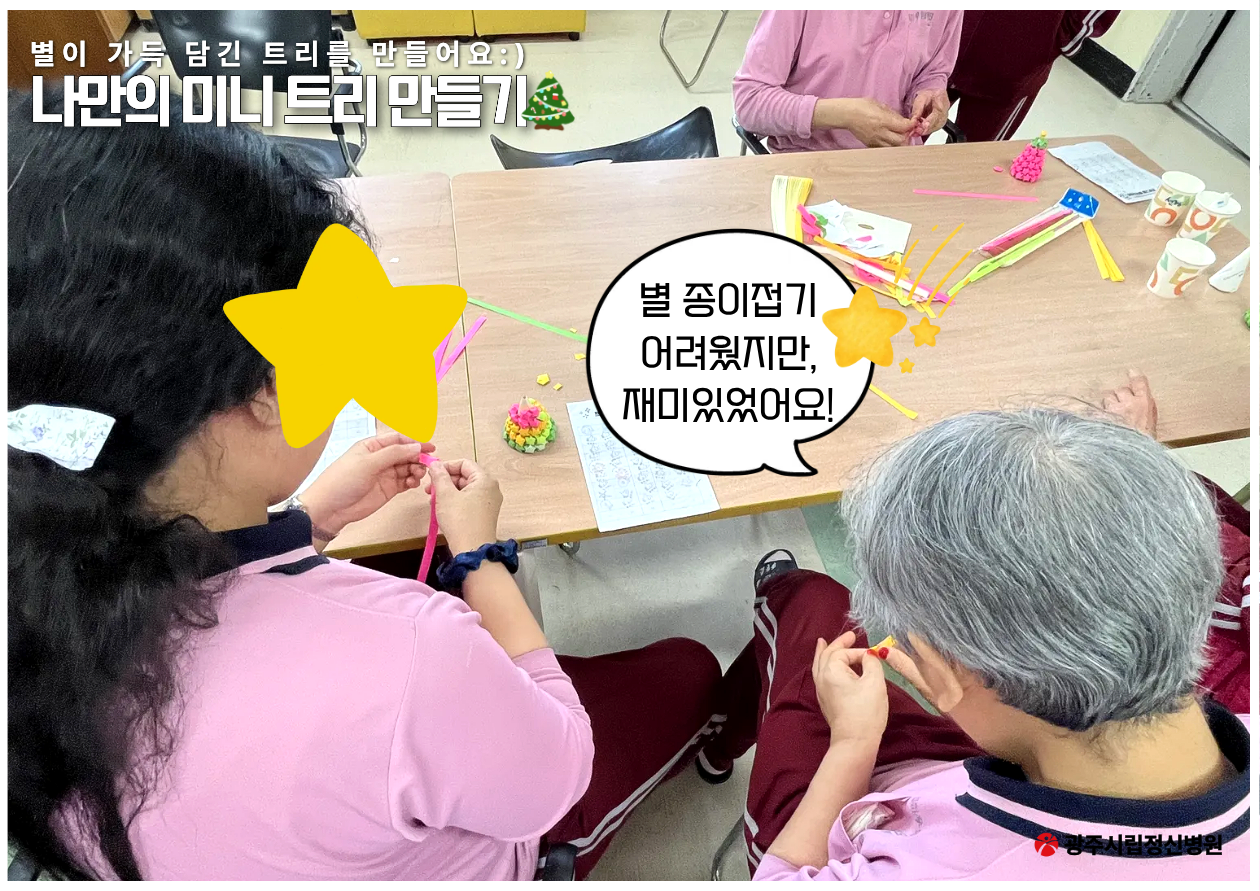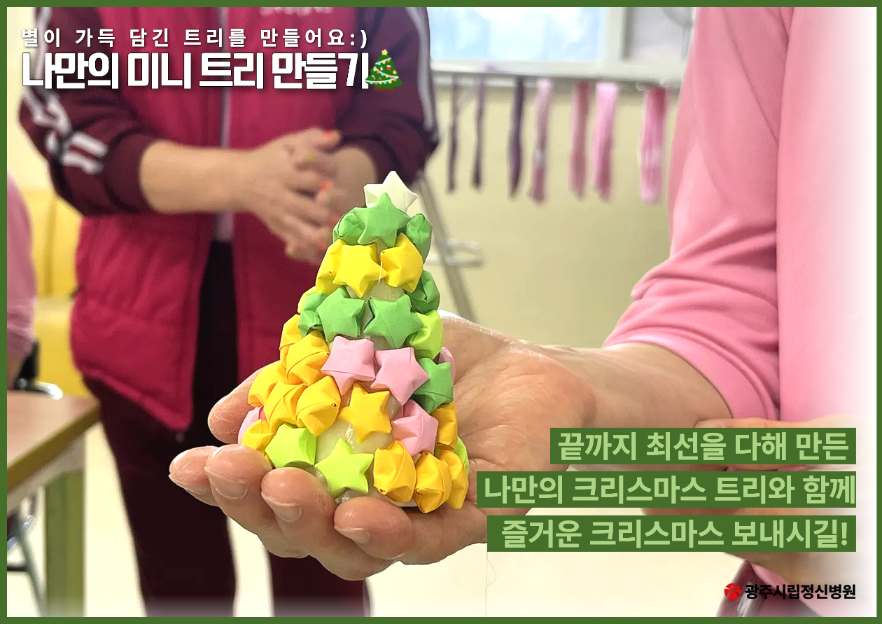 고운병동에서는 다가오는 크리스마스를 기다리며 '나만의 미니트리 만들기' 미술요법 시간을 가졌습니다. 정성스럽게 종이를 접어 만든 별들을 미니 트리에 하나하나 장식하며, 병동 안에 화사한 연말의 분위기를 더해보았습니다. 손끝으로 별을 만들고 트리를 완성해가는 과정을 통해 환우분들이 계절의 정취를 느끼고, 스스로 작품을 완성했다는 뿌듯한 성취감을 경험할 수 있었던 따뜻한 시간이었습니다.
