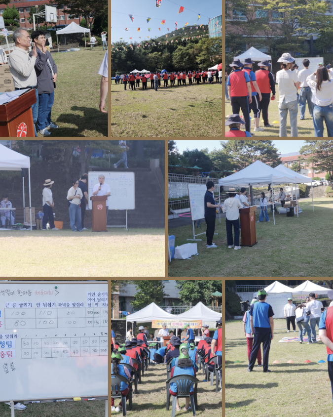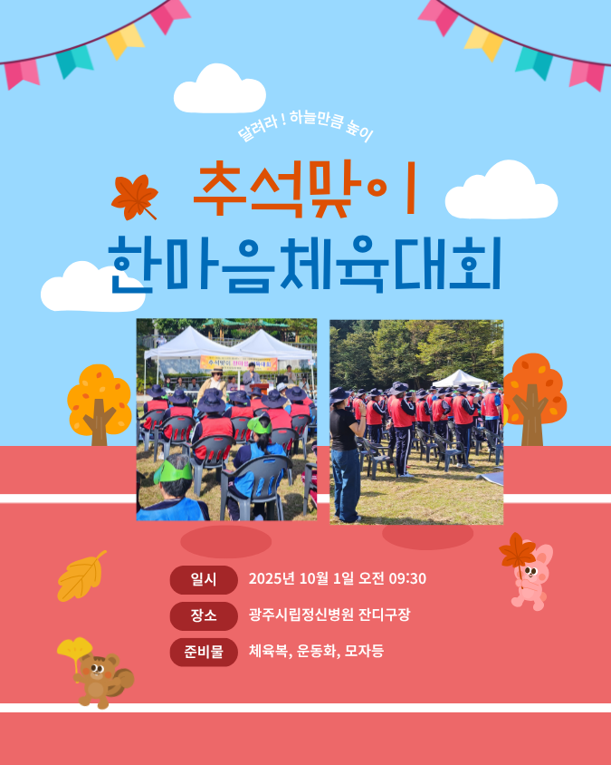 광주시립정신병원은 2025년 10월 1일(수) 오전 9시 30분, 병원 잔디구장에서 정신공공사업팀 주관으로 체육의 날 행사를 열었습니다. 가을 햇살 아래 설치된 하얀 텐트와 깃발, 안전요원의 안내 속에 참가자들은 붉은색·파란색 조끼를 입고 팀을 나누어 경기장에 섰습니다. 간단한 준비운동 후 협동 공놀이, 릴레이, 딱지 맞추기 등 충돌 위험이 낮은 협력 종목 위주로 진행되어 누구나 안전하게 참여할 수 있었고, 휴식 시간에는 음수대와 간식부스가 운영되어 건강과 안전을 최우선으로 챙겼습니다.