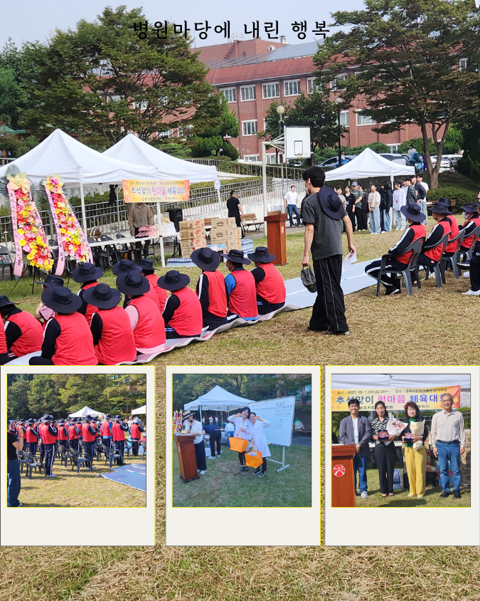 행사 중간에는 전 참여팀이 함께 사진을 찍으며 서로를 응원했고, 마지막에는 공정상·협동상·종합우승 시상이 이어졌습니다. 환자·가족·직원이 한자리에 모여 웃고 손뼉 치는 시간은 자연스레 정서적 안정과 팀워크를 키웠고, “병원 마당에 내린 행복”이라는 문구처럼 잔디 위에 평안한 분위기가 오래 남았습니다.
